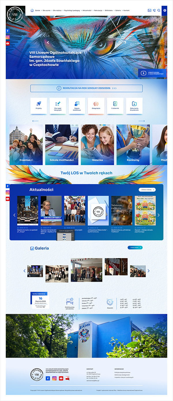 Serwis zawiera również rozbudowane sekcje funkcjonalne, m.in. kalendarz wydarzeń, harmonogram spotkań z rodzicami, listę kadry pedagogicznej, informacje rekrutacyjne oraz materiały wspierające proces naboru, w tym film prezentujący szkołę. Całość została