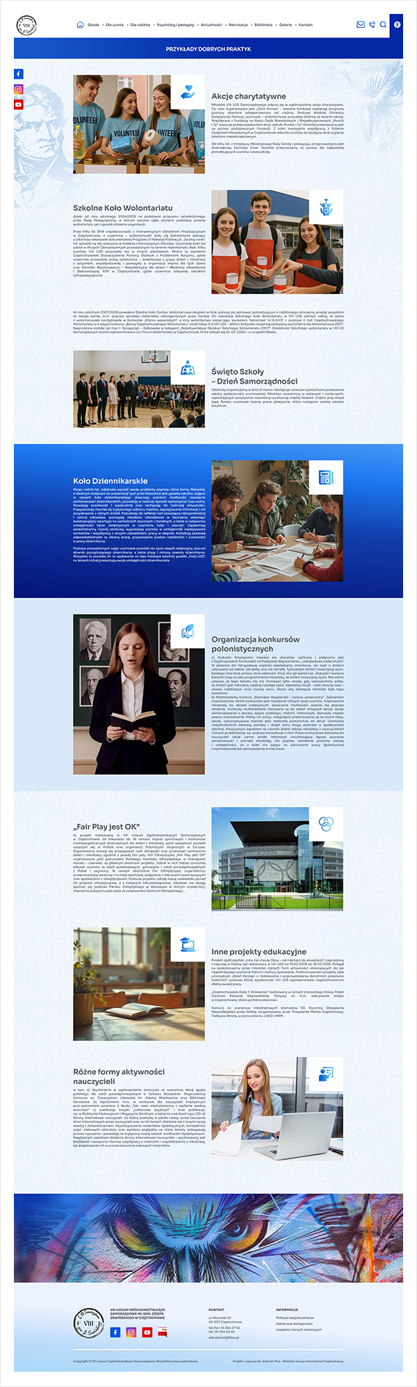 Strona została zaprojektowana w nowoczesnym stylu, z wykorzystaniem autorskiej kolorowej ikonografii, spójnych grafik oraz subtelnych animacji, które nadają całości dynamiczny, ale nienachalny charakter. Przejrzysta struktura informacji umożliwia szybki dostęp do kluczowych treści, takich jak aktualności, dokumenty szkolne, osiągnięcia uczniów, konkursy, gazetka szkolna, działalność zespołu teatralnego czy oferta edukacyjna.
