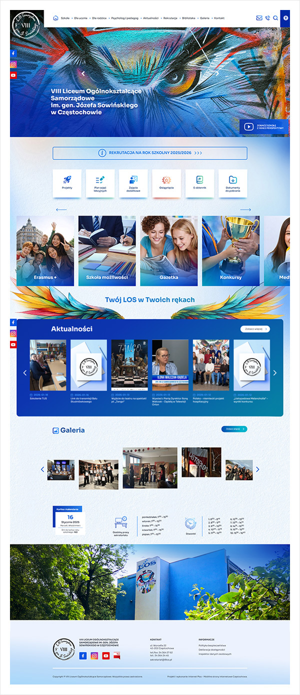 Serwis zawiera również rozbudowane sekcje funkcjonalne, m.in. kalendarz wydarzeń, harmonogram spotkań z rodzicami, listę kadry pedagogicznej, informacje rekrutacyjne oraz materiały wspierające proces naboru, w tym film prezentujący szkołę. Całość została