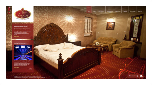 Dla Hotelu wykonaliśmy elegancką stronę internetową, opartą na wysmakowanych zdjęciach, oddających nastrój tego urokliwego miejsca. Bogata oferta Złotych Arkad przedstawiona została w nowoczesnej formie, na szczególną uwagę zasługuje prezentacja hotelowych pokojów. Opis wyposażenia i możliwości organizacyjnych z pewnością ułatwią planowanie eventów – tych biznesowych i tych rodzinnych. Strona umożliwia też bezpośredni kontakt z obsługą w celu rezerwacji pokoju, stolika w restauracji czy toru na kręgielni. Stałe miejsce na stronie mają aktualności – w ten sposób szybko można dotrzeć do informacji o najnowszych promocjach i wydarzeniach.